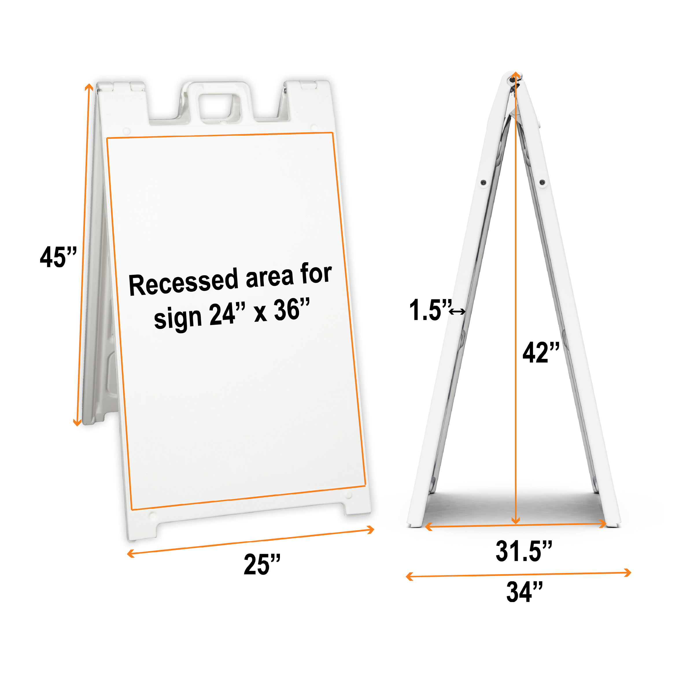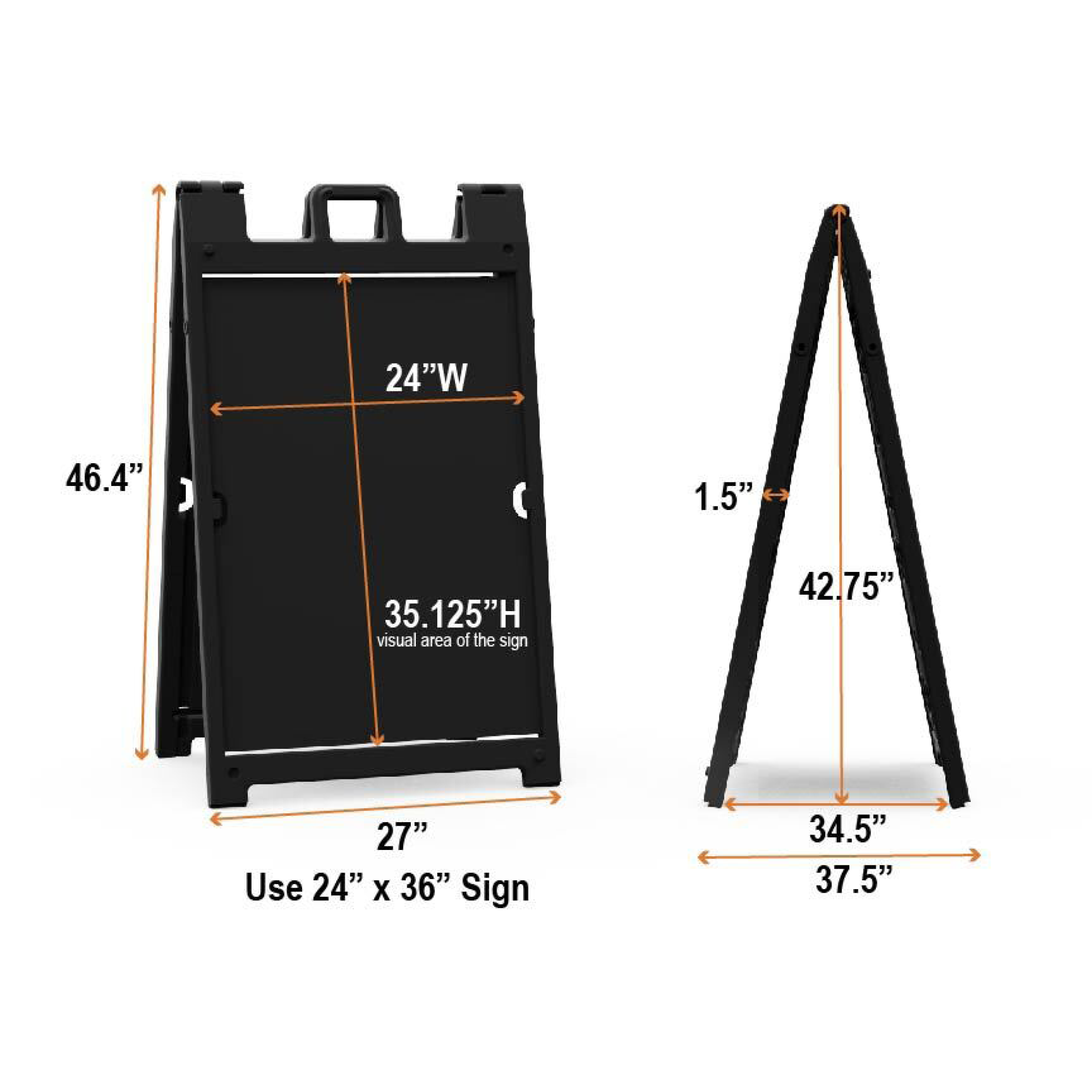 Weatherproof: The combination of high-quality plastic and added weight from sand/water makes these signs perfect for outdoor use. Rain or shine, your A-Frame sign can endure it all. Portable: The collapsible A-Frame and convenient handle make it easy to move your sign from one location to another. Stacking lugs also make storage for one or more A-Frames as easy as can be! Maximum Visibility: Because every A-Frame is double-sided you can make sure everyone sees your message! Print both sides the same or customize each side for no additional charge. Reusable: Store your signs and use them as you always have, place a new decal over top the existing one (standard frames), or swap inserts (premium frames) to change your messaging and use your A-frame signs for years to come.