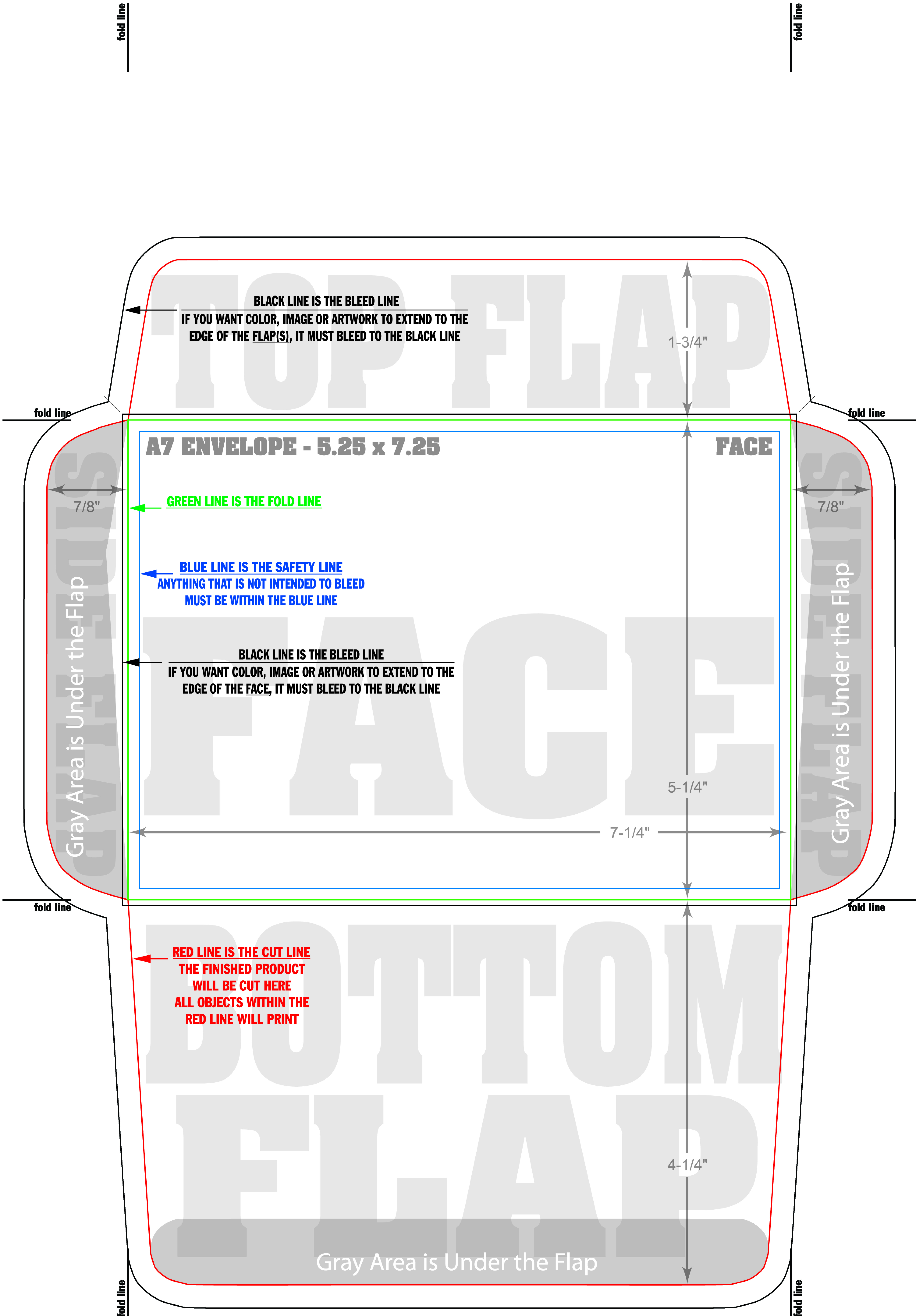 Full bleed envelopes are printed flat on offset presses, then die cut and converted into envelopes. For offset envelopes with bleed on the face or print on any flap, it is required that the artwork be placed on our certified envelope template.