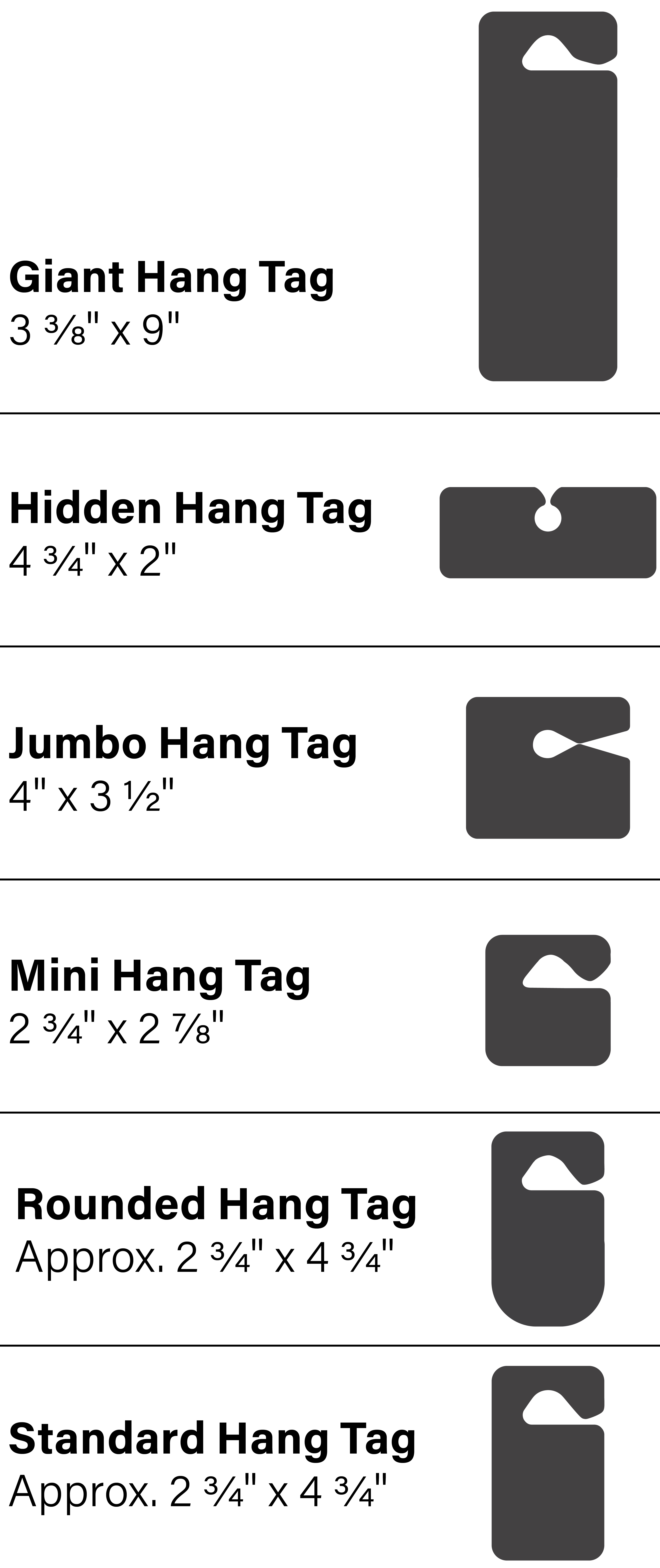 2.75"x4.75" Standard Hang Tag 3.5"x4" Jumbo Hang Tag 3.375"x9" Giant Hang Tag